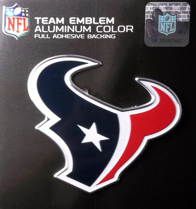 NFL Houston Texans Auto Emblem with Color, Licensed (promark). Plastic auto emblem can be applied to a vehicle or any other hard surface with the automotive 3M tape included on the emblem. Can be removed with out damaging paint or surface and is UV protected.